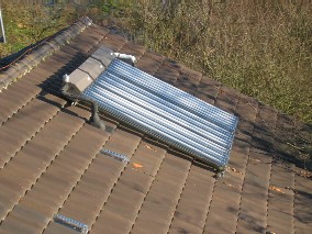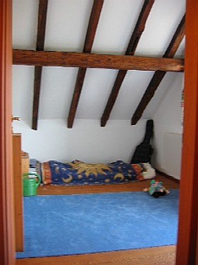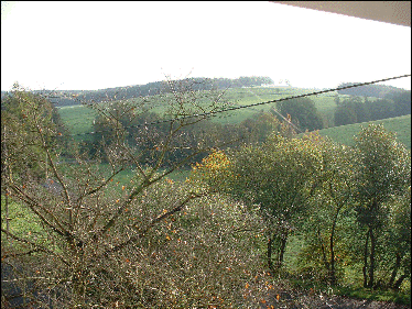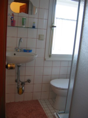 So sieht es aus: das kleine Tal. Direkt vor dem Haus beginnen viele herrliche Wandewege, Jogging-Strecken, Rad- und Reitwege...... Von hier oben kann man sich auch gut den Solar-Kollektor ansehen: Ein sehr energieeffiziente Anlage, die uns viel Geld gespart hat. Im Winter wird das Wasser gut vorgewärmt und so Energie gespart. Ab April/Mai wird das Warn-Wasser für das Haus komplett durch die Vakuum-Röhren erhitzt. Doch bevor wir das Gästezimmer wieder verlassen wollen wir es uns ansehen. Das besondere an diesem Raum ist sein eigener Zugang aus dem Treppenhaus und sein kleines Badezimmer mit Dusche und WC: Doch nun : zurück in den Hof.
