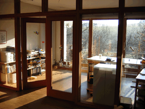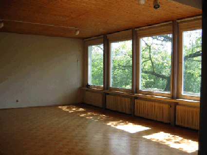 Das Bild zeigt den “neuen” Klassenraum im Anbau mit ca. 70 qm. Es wurde zuletzt als Büro benutzt. Während der über 4 Jahre dauernden Renovierung des Haupthauses war dies ein herrliches Wohnzimmer. Fünf große Fenster zeigen nach Süden und erlauben den Blick in das kleine Tal und auf die Pferdewiese des Nachbarn. Zusätzlich zu diesem Raum gibt es nebenan - auch mit Blick nach Süden - einen etwa 20 qm großen Raum mit Schiebefenster und Zugang zum Garten und einer kleinen Terrasse.
