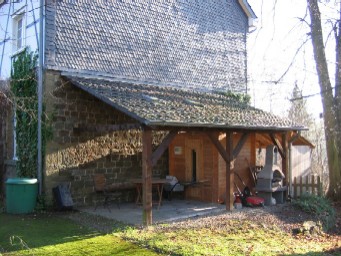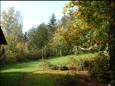 So sieht es aus, wenn man aus dem Haus in Richtung Westen tritt. Einen Blick in unseren Garten, der durch eine Hecke vor neugierigen Blicken geschützt ist. Es sind etwa 400 qm der Umlage zu sehen. Der Rest ist Wiese und Naturgarten, in dem es viele seltene Vögel zu sehen gibt. Das ganze Grundstück ist mit einer Vogelschutzhecke umgeben. Unser kleines Tal ist, wegen seiner Artenvielfalt, unter Vogelkundlern wohl bekannt. Links erkennt man noch die Spitzes der Remiese, darunter befindet sich die Sauna.