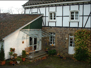 Das ist der Blick vom Garten zum Eingang. Hier erkennt man schön, den alten Teil mit der Bruchsteinmauer und dem Fachwerk. (Die Tür in der Bruchsteinwand geht übrigens direkt ins Wohnzimmer). Ganz in weiß der Anbau aus dem Jahr 1959. Hier ist zur Zeit das Büro untergebracht, kann aber ganz einfach als zweite attraktive Wohnung genutzt werden. Das soll unser kleiner Überblick über die Alteschule gewesen sein.Vielleicht können Sie jetzt erahnen, wie schön das Anwesen ist und welches Potential es noch bietet. Zur besseren Orientierung können Sie hier die Baupläne der Schule sehen. Sollten Sie ein ernsthaftes Interesse an der alten Schule haben freuen wir uns über eine Nachricht ->email an die Besitzer der alten Schule. |